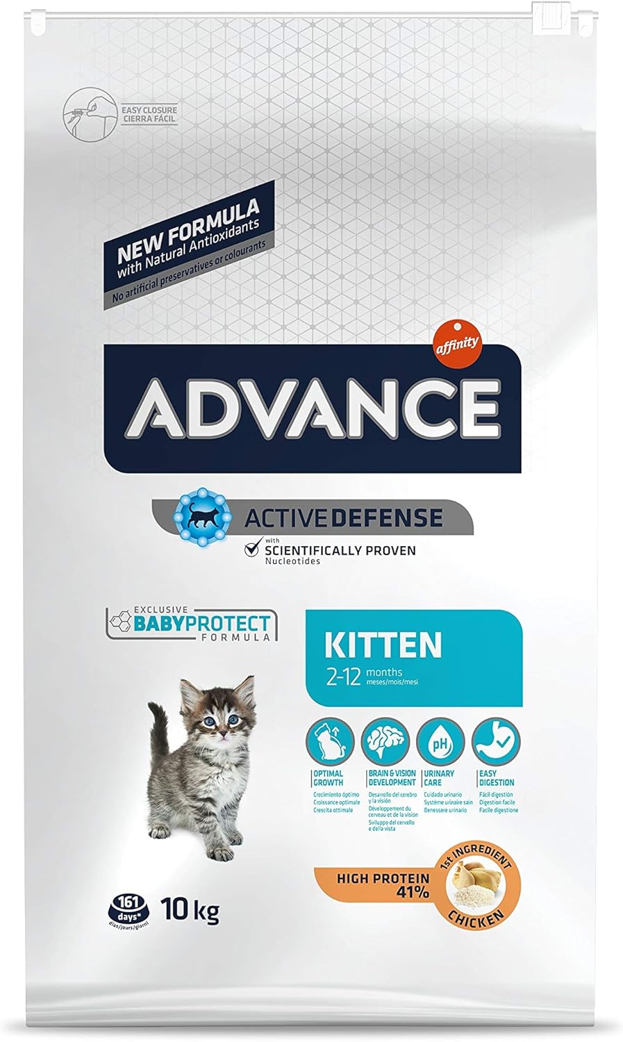 Si votre chaton a moins d'un an, il traverse une étape où il subit le plus de changements au niveau du physique et de la conduite. Par conséquent, il a besoin d'un produit spécifique qui l'aide à devenir robuste et en bonne santé. ADVANCE Kitten est un aliment haut de gamme, élaboré spécialement pour couvrir les besoins des chatons et des mères à la fin de la gestation ainsi que pendant l'allaitement. Grâce à sa formule exclusive enrichie à base de nucléotides, ADVANCE Kitten favorise une croissance optimale. Il aide le développement du cerveau et de la vision, tout en renforçant les défenses naturelles du chaton, afin de préserver sa santé. ADVANCE Kitten est particulièrement recommandé pour les chatons d'entre 2 et 12 mois ainsi que pour les chattes gestantes et allaitantes.