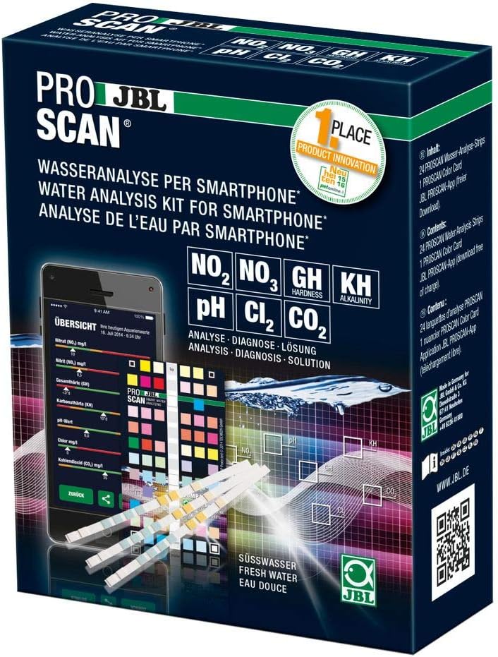 Analyse et diagnostic de l'eau par smartphone : contrôle facile et sûr des paramètres d'eau des aquariums d'eau douce. Détermination de : dureté totale, dureté carbonatée, pH, nitrite, nitrate, chlore et calcul du CO2. - La nouvelle génération de l'analyse de l'eau : télécharger gratuitement l'appli ProScan-App, plonger la bandelette test dans l'eau de l'aquarium, la poser sur le nuancier pour l'analyse. Le nuancier est scanné, les paramètres sont calculés. - Diagnostic rapide, résultats précis : les résultats du test sont à la fois affichés en chiffres et évalués (bien/moyen/mauvais). En complément, affichage de conseils d'optimisation pour aquariums d'eau douce et bassin. - Compatible avec iPhone et iPad : exige iOS 7.0 ou plus récent, version Android 4.0 ou + et un appareil photo avec autofocus. - Contenu de la livraison : 1 boîte ProScan, 24 bandelettes d'analyse d'eau, 1 nuancier ProScan, 1 appli ProScan App à télécharger gratuitement